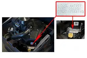 This label is located on the frame under the operator seat. Move the operator seat into the service position and locate the label on the frame. Search the complete model number to find parts and accessories for your model.