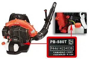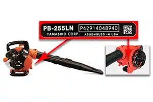 Echo model numbers are displayed on the housing in the form of a decal (Example: PB255). The complete model number and the 12 character serial number are located near the engine block. (Example T12345678901). The serial number aides in finding specific parts and accessories.