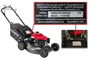 Honda HRR and HRX model and serial numbers are printed on black and silver labels. This label is located on top of the cutting deck at the left rear corner. Search by model number and verify serial number when ordering parts and accessories for your mower.
