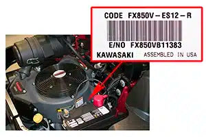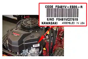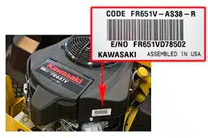 Kawasaki engines feature a 6 character model number (Example: FR691V). This model is often featured on the fan housing. There is an additional 4 character code for specific parts (Example: FR691V-BS19). This model and code can be found on a silver decal on the engine block.
