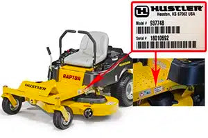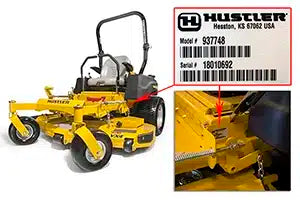 Hustler Turf Equipment models are 6 digits (Example 931899). The model numbers are easily located on the left side of the frame. All models are clearly marked on a silvery white label under the left control arm or the left side of frame.