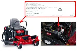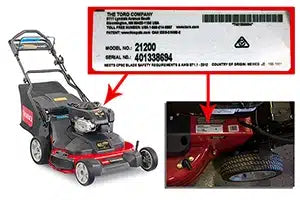 Model and serial number plates are located on black or silver decals on the front of the frame. Some top saws have feature a decal on the top of the housing. Search by model number and verify serial number when ordering parts and accessories for your mower.