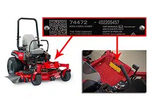 Toro Titan model and serial numbers are stamped into a black sheet metal plate. This plate is located on the front of the operator platform. Search by model number and verify serial number when ordering parts and accessories for your mower.